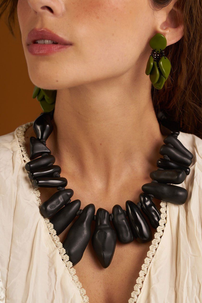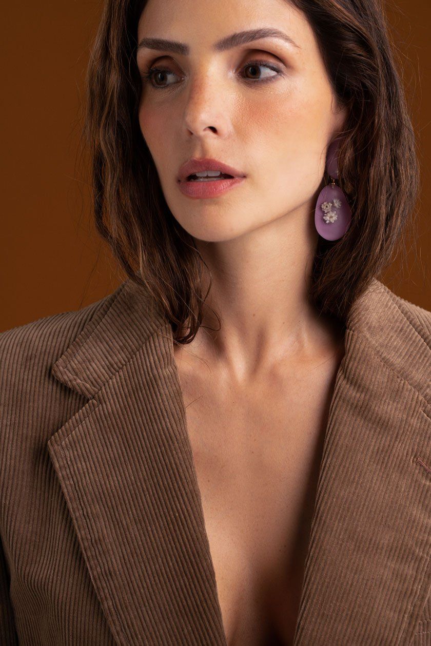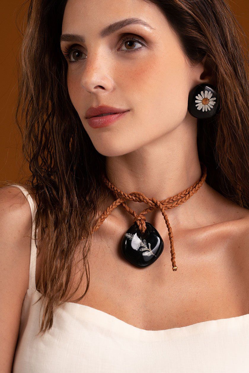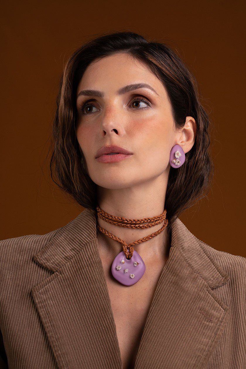 Nessa releitura, empresto o meu olhar para a estética translúcida do âmbar que me encantou desde o primeiro momento. Os shapes translúcidos agregam criatividade e servem como base para as composições com seiva seca que tem um ar contemporâneo e cheio de personalidade a cada uma das peças.